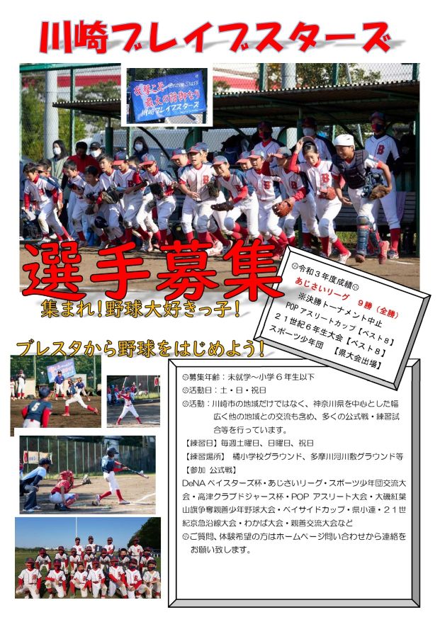 ブレイブスターズは、日本体育協会スポーツ少年団に加盟し子ども会等に属していない クラブチームです。 お子さんが、野球が好きでやりたいというかたは、ぜひ一緒にやりませんか。 皆さん、有志の集まりでクラブを運営しています。お父さん・お母さん方の仕事が忙しく チームになかなか協力できない方でもご相談ください。 時間が取れたときに、お子さんの練習風景や、試合などを見ていただくだけでも 協力いただいていると思います。 体験はいつでもOKですので、お問い合わせからご連絡ください。 入部の際には、入部届けを提出していただきます。 各種資料欄の入部届けをクリックすると表示しますので、印刷後、必要事項を ご記入の上、提出ください。 |